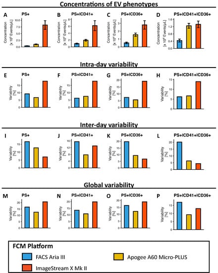 Concentrations and variability in the detection of EV phenotypes on three different flow cytometry platforms. (A–D) Concentrations of (A) PS+, (B) PS+|CD41+, (C) PS+|CD36+ and (D) PS+|CD41+|CD36+ EVs detected on the three different platforms. Results are depicted as mean (bar) ± 1SD (error bars) of concentrations from the inter-day variability study. (E–H) Intra-day variability in the detection of (E) PS+, (F) PS+|CD41+, (G) PS+|CD36+ and (H) PS+|CD41+|CD36+ EVs (n = 20 per platform). (I–L) Inter-day variability in the detection of (I) PS+, (J) PS+|CD41+, (K) PS+|CD36+ and (L) PS+|CD41+|CD36+ EVs (n = 5 × 5 per platform). (M–P) Global variability in the detection of (M) PS+, (N) PS+|CD41+, (O) PS+|CD36+ and (P) PS+|CD41+|CD36+ EVs (n = 40 per platform). Coefficients of variability (CV) were calculated as SD/mean expressed in percent.