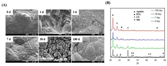 Apatite formation ability is usually used to predict in vivo bone bioactivity of scaffolds [32]. To confirm bioactivity, we observed apatite precipitation on the surfaces of the scaffolds over a specific time period. The surface morphology and microstructure of the MS/CS scaffold were characterized with SEM and XRD after it was immersed in SBF. The MS/CS scaffold exhibited a smooth and flat surface before being immersed in SBF (Figure 2). However, the composition contains 50% MS/CS nano-particles, which cannot be found on the surface microstructure. It is speculated that during the printing process of the scaffold, the composite material in the syringe is pushed through the needle by air pressure so that the nano-particles on the surface are squeezed into the scaffold. After 1 and 3 days of immersion in SBF, apatite precipitation was observed on the surface of the MS/CS scaffold, with spherical aggregated minerals with an average diameter of approximately 1 μm. Notably, the apatite aggregates generally covered the surface of the scaffold. After 180 days, the surface was completely covered with high-density, needle-shaped crystals and cracks. Previous studies have shown that 3D printing for the treatment of bone disease is a convenient process that can help to hasten healing after surgery [22]. Calcium-silicate-based materials have been identified as causing hydroxyapatite precipitation and crystallization, which substantially enhance bone formation in bone defect regions [22]. A combination of collagen and hydroxyapatite or β-tricalcium phosphate in scaffolds made of polymer biomaterials was found to activate the bone formation signaling pathway, which subsequently led to bone regeneration [33]. One study showed that after immersion in SBF for 7 days, the surface of a mesoporous calcium magnesium silicate scaffold contained nano-pore particles when viewed under high magnification. Another study showed that MC3T3-E1 cells cultured with mesoporous bioactive glass scaffolds for a week adhered strongly to the surface of the scaffolds and were reported to have induced bone mineralization after 3 weeks of culture [34].