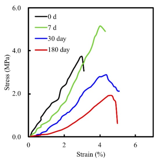 Stress–strain curve of the MS/CS scaffold after immersion in SBF for 7, 30, and 180 days.