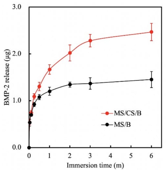 Bone morphogenetic protein-2 (BMP-2) release from an MS/CS/B and MS/B scaffold after immersion in Dulbecco’s modified Eagle’s medium (DMEM) at 37 °C for 6 months.