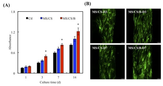 (A) The proliferation of the human dental pulp cells (hDPSCs) cultured on scaffolds for 1, 3, 7, and 14 days. * indicates a significant difference (p < 0.05) when compared to MS/CS. (B) F-actin filament (green) staining of hDPSCs cultured on different scaffolds for 3 and 7 days. The scale bar of the photograph is 100 µm.