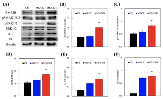 hDPSCs were used to verify whether the MS/CS/B scaffold can effectively induce bone formation and regeneration. The Western blot results quantified BMP2R, p-SMAD1/5/8, p-ERK, ALP, and OC expression on all of the scaffolds (Figure 7). The levels of BMP2R, SMAD1/5/8 phosphorylation, and ERK phosphorylation were significantly increased on the MS/CS/B scaffold, whereas there were no significant incremental increases seen in the control or MS/CS scaffolds. Interestingly, the ALP and OC expression levels were similar for the MS/CS and MS/CS/B scaffolds, indicating that the mesoporous characteristics associated with both scaffolds do promote bone mineralization, osteogenesis, and cell growth. The ALP and OC expression levels, as well as BMP2R and p-ERK expression, were 2-fold and 2.3-fold higher for the MS/CS/B scaffold as compared to the MS/CS scaffold and control delivery system, respectively, while the ALP and OC expression levels were 2.5 times higher for both the MS/CS and MS/CS/B scaffolds as compared to the control delivery system. BMP2R plays a crucial role in mediating the osteogenesis of osteoblast cells, cell differentiation, and bone regeneration [45]. In addition, the activation of intracellular SMAD is known to regulate stem-cell-differentiation-related protein expression that is sensitive to the cultured microenvironment around the cells [46]. A previous study indicated that BMP-2 could stimulate SMAD1/5/8 and affect the osteogenic pathway [26]. Thus, the combined effect of Si ion and BMP-2 could active multiple molecular pathways in several primary cells, resulting in promoted osteogenic differentiation.
