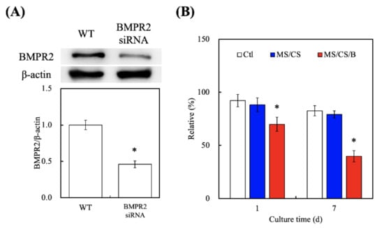 Figure 8A shows the successful knockdown of BMPR2 using the siRNA as compared to the wide-type group. BMPR2 protein levels were subsequently inhibited by 54% after BMPR2 knockdown as compared to the wide-type group. After BMPR2 knockdown in the MS/CS/B scaffolds, cell quantities were found to be significantly decreased by 21.7% and 49.7% after culture for 1 and 7 days, respectively (Figure 8B). A number of studies on BMP-2 have revealed that BMP-2 is an important mitogen for primary cell behavior and further regulates downstream osteogenic differentiation via the BMP-2/ BMPR2/ mitogen-activated protein kinase (MAPK) signaling pathway [47]. Furthermore, BMP-2 and BMPR2 were trialed in clinical applications for bone fracture regeneration, and local recombinant human BMP-2 was also reported to improve healing in humans [48]. BMPR2 plays an important role in several types of cell migration and proliferation, and many physiologic behaviors of BMPR2 are completed by activating the MAPK and phosphoinositide 3-kinases (PI3K) signal pathways [49,50].