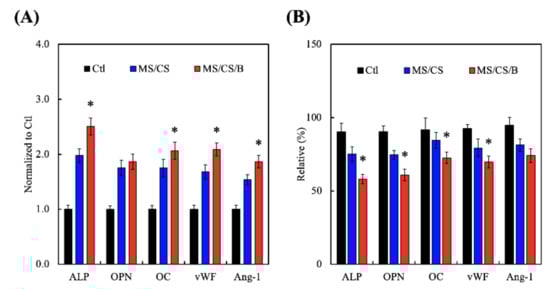 Cytokine-carrying scaffolds promote the secretion of bone-related proteins, such as TGF-β, BMP-2, Runt-related transcription factor 2 (Runx2), and osterix, during the bone-healing process. To characterize the role of MS/CS in osteogenesis, we analyzed the in vitro expression profiles of alkaline phosphatase (ALP) and OPN and used ELISA to examine the effectiveness of MS/CS/B in the induction of bone-related proteins and angiogenesis factors (Figure 8A). The levels of ALP, OPN, OC, vWF, and Ang-1 were significantly higher in the hDPSCs from the MS/CS/B scaffold as compared to the cells from the MS/CS scaffold or the control drug delivery system (Figure 9A). Protein expression was higher in the MS/CS/B scaffold than in either of the other two study groups. Vascular endothelial growth factor (VEGF) plays a critical role in cellular survival during the bone regeneration process, and blood supply plays an important role in endochondral ossification, during which vessels sprout and provide nutrients and oxygen that enable bone cells to stimulate cartilage formation and mineralization [51]. Inhibiting VEGF results in bone cell apoptosis, lowers bone mass, and leads to bone fractures [52]. Furthermore, blocking ALP and bone sialoprotein (BSP) interferes with calvarial bone repair, while upregulation of BMP2R, extracellular regulated protein kinases (ERK), ALP, and osteocalcin (OC) bone turnover markers mediates bone formation signaling pathways. In addition, significant (p < 0.05) decreases (49%, 39%, and 27%, respectively) in ALP, OPN, and OC (Figure 9B) protein synthesis were found in BMPR2-knockdown hDPSCs cultured on MS/CS/B scaffolds after 7 days. In this study, the expression of vWF and Ang-1 of hDPSCs proved that angiogenesis has a similar pattern for the BMPR2 signaling pathway of osteogenesis.