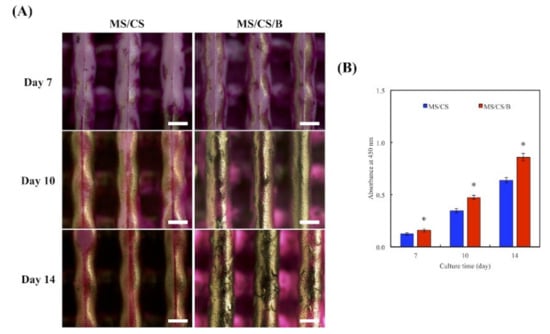 (A) Alizarin red S staining and (B) quantification of hDPSC calcium mineral deposits cultured on specimens for 7, 10, and 14 days. * indicates a significant difference (p < 0.05) when compared to MS/CS. The scale bar of the Optical microscope photograph is 400 µm.