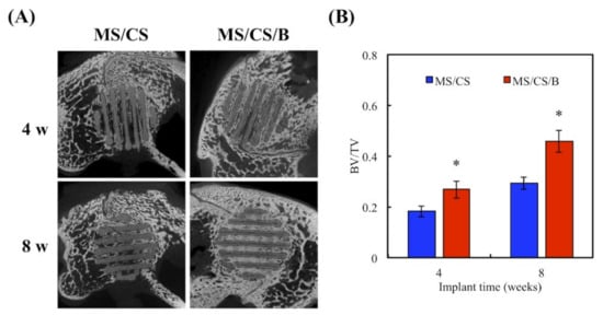 (A) Micro-CT image showing the morphology of bone growth for a fixed-sized critical lesion after it underwent 8-week regeneration with scaffolds; (B) data analysis of relative bone mass volume (bone volume/tissue volume (BV/TV) ratio) for a fixed-sized critical lesion after it underwent 8 weeks of regeneration with scaffolds. * indicates a significant difference (p < 0.05) when compared to MS/CS.