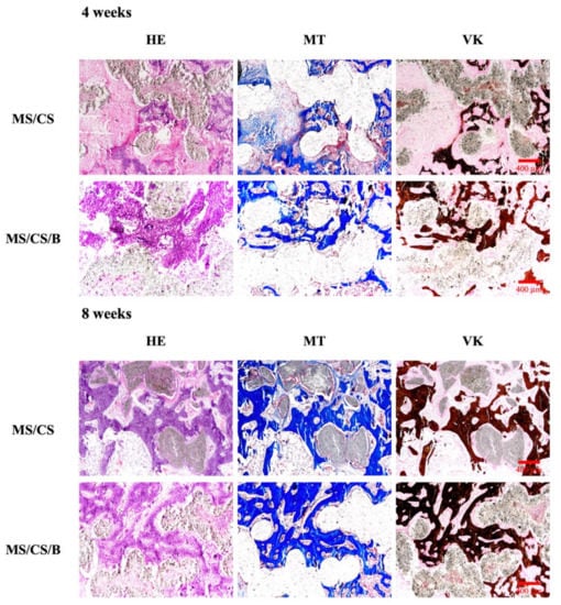 After 8 weeks of implantation in rabbit femurs, micro-CT analysis clearly showed time-dependent increments of bone formation, improved bone density, and tissue reconstruction with the MS/CS/B scaffold as compared to the MS/CS scaffold (Figure 11). The MS/CS/B scaffold had excellent osteoinduction characteristics due to the fact that it was surrounded by newly regenerated bone. Simultaneously, with the implantation of the MS/CS/B scaffold, the bone volume/tissue volume (BV/TV) ratio was also upregulated over time. Thus, it can be seen that BMP-2 and osteogenesis are critical factors in bone healing [53,54]. Recently, a 3D-printed ceramic scaffold was shown to have osteoinductive potential, and it was found that the scaffold improved bone cell mineralization in a calvarial defect model. Micro-CT showed that the ceramic scaffold improved tissue repair and cell ingrowth in pores in order to fill the defect region. Therefore, osteoinduction and tissue reconstruction induced by bioscaffold activation are important factors in bone regeneration and bone fracture repair [53,54]. In this study, we applied micro-CT technology to investigate bone regeneration and to quantify the bone volume and tissue volume ratios. Our results demonstrated that the MS/CS/B scaffold could support bone defect healing and provide a good microenvironment in which to accelerate the repair of damaged tissue. The time-dependent mineralization associated with an MS/CS/B scaffold is considered to be important in the treatment of bone diseases. Histologic analysis of the femur revealed that the MS/CS/B scaffold had markedly increased bone tissue structure, collagen formation, osteoid tissue, and greater proportions of calcified bone. The above phenomena were further confirmed via H&E, Masson’s trichrome (MT), and von Kossa staining (VK) (Figure 12), thereby suggesting that the MS/CS/B scaffold was able to effectively increase in vivo bone regeneration and bone formation. Consistent with the micro-CT results, H&E staining showed more tibia integrity in the MS/CS scaffold groups with or without BMP-2. MT and VK staining also indicated collagen and calcification were upregulated via the MS/CS/B scaffold 8 weeks after implantation. Taken together, our findings demonstrated that the 3D-printed, radially oriented MS/CS/B scaffold is significant in bone regeneration in the rabbit tibia defect model. Previously, Li et al. suggested that different kinds of mesoporous bioactive ceramic scaffolds may contribute to osteogenesis and chondrogenesis in a clinical setting [55]. The excellent osteoconduction in ceramic-based scaffolds due to the ceramic materials promoted the bone formation and also led to bone repair in ovine tibia defect patients [56]. In addition to ceramic-material-induced bone repair, other research has reported that growth factor BMP-2 treatment increases bone formation in bone defects within the first few weeks, thus indicating that BMP-2 may play a role in mediating bone activity in osteogenesis and bone formation [57]. Increasing evidence indicates that upregulation of collagen and mineralization contributes significantly to bone development and bone homeostasis [29]. Our study showed that the MS/CS/B scaffolds were able to increase cell proliferation, osteogenesis, and angiogenesis, thereby indicating their potential in the treatment of bone disorders or bone loss. In conclusion, the experimental evidence from this study suggested that the MS/CS/B scaffold had a high degradation rate and high mechanical strength and was able to enhance ALP, OPN, OC, vWF, and Ang-1 expression in a time-dependent manner. The in vivo evidence demonstrated that the MS/CS/B scaffold had excellent osteoinduction and osteogenesis characteristics.