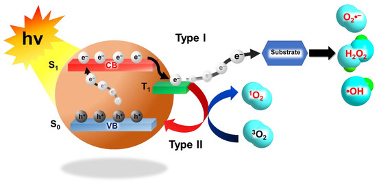 Schematic illustration of Type I photodynamic therapy (PDT) and Type II PDT. (hv: photon energy; CB: conduction band; VB: valence band).