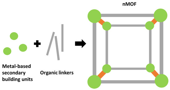 Schematic illustration of the construction of a nanoscale metal–organic framework (nMOF) from metal-based secondary building units and organic linkers.