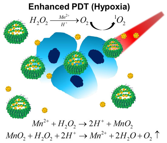 Schematic illustration of Mn–CD assembly catalyzing the decomposition of H2O2 to oxygen under acidic/hypoxic microenvironments, which exerts oxygen-enhanced PDT. Reproduced with permission [45]. Copyright 2018, Wiley-VCH.