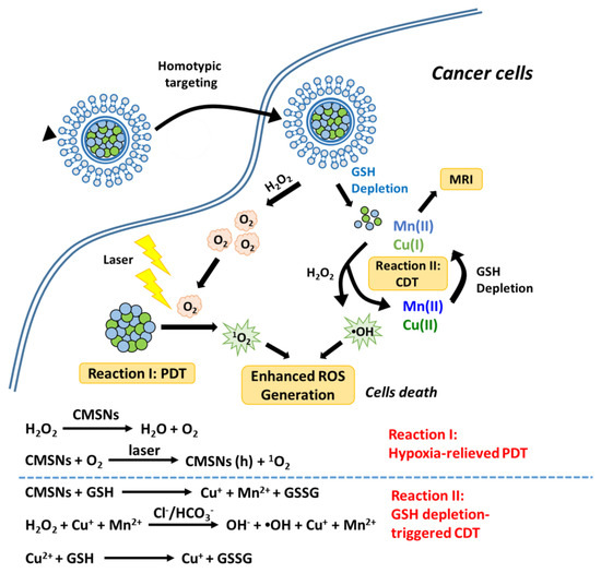 Generally, chemodynamic therapies (CDTs) kill tumor cells by •OH generated from in situ H2O2 by a Fenton/Fenton-like reaction, without the help of oxygen and external energy input [95]. Thus, the hypoxic tumor microenvironment with mild acidity and elevated H2O2 levels, provides a perfect working condition for CDT [104,106,107]. It has been shown that Fenton/Fenton-like reactions can simultaneously produce oxygen along with •OH, suggesting that CDT may relieve oxygen deficiency in PDT and improve its therapeutic efficiency [102,105]. In addition, the UV–Vis or NIR irradiation used in PDT can improve •OH generation efficiency in Fenton reactions to enhance the activity of CDT [103,104]. All this evidence hints that CDT will be a good partner for PDT combination therapy. For example, Liu et al. fabricated a biodegradable biomimic copper/manganese silicate nanospheres (CMSNs) for CDT/PDT synergistic therapy [95]. They showed that the CMSNs could not only exhibit effective PDT under irradiation, but also could diminish GSH levels and catalyze CDT for generating •OH at the same time (Figure 5).
