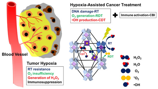 Schematic illustration of the mechanism of the nMOF as a multifunction platform for combining CDT, radiotherapy (RT), RDT, and immunotherapy for treating hypoxic tumors. Reproduced from [118]. Published by The Royal Society of Chemistry.