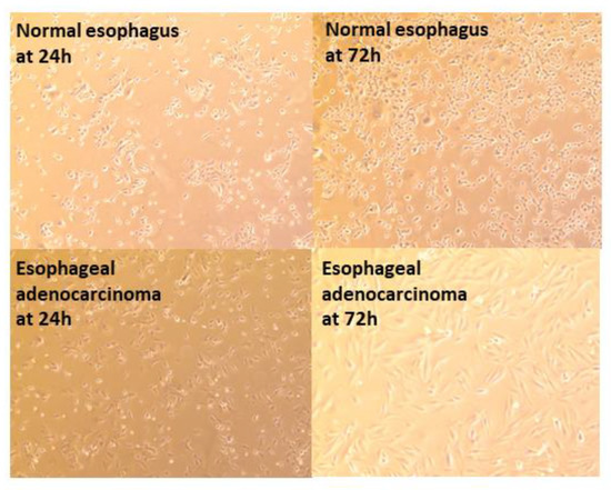 Primary and immortalized cell lines have been created previously by our lab using nasal and vaginal mucosa [27,28,29]. To create esophageal cell lines, immortalized cell lines were derived from human esophageal mucosal biopsies transformed with human papilloma virus E6E7. Primary and immortalized cell were cultured to form a monolayer of squamous cells representative of the esophageal epithelium. Normal esophagus and adenocarcinoma immortalized cell lines are shown at both 24 h and 72 h (Figure 1).