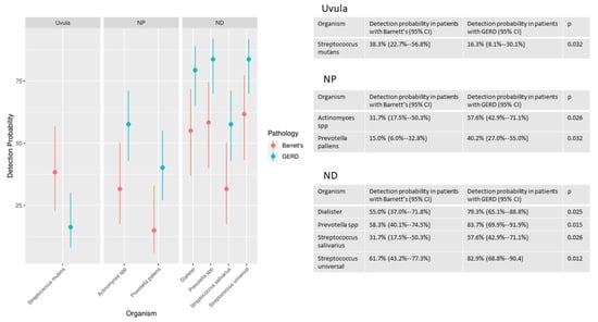 There were statistically significant differences in the likelihood of detection of multiple organisms in the Barrett’s group compared to the GERD without Barrett’s group. There were significant differences in likelihood of detection in one species (Streptococcus mutans) at the uvula, two genera or species (Actinomyces, Prevotella pallens) at the NP and four genera or species (Dialister, Prevotella unspecified, Streptococcus salivarius and Streptococcus unspecified) at the ND (Figure 3).