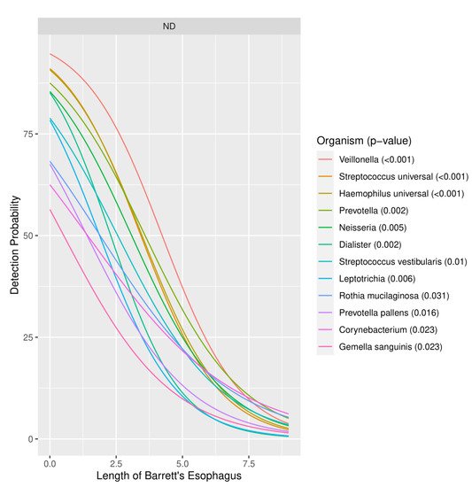 There was a decreased likelihood of detection of multiple organisms as the length of the Barrett’s column increased. In particular, 10 different genera (Corynebacterium, Dialister, Gemella, Haemophilus, Leptotrichia, Neisseria, Prevotella, Rothia, Streptococcus and Veillonella) on the EMB array had a significantly decreased likelihood of detection as the length of the Barrett’s column increased (Figure 4). Given that 2-way Firth-penalized logistic regression was used, the curves show the probability of detection of an organism being detected for any length of Barrett’s esophagus. The only curves included in Figure 4 are for organisms for which length is a significant predictor at an α ≤ 0.05.