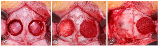 Intrasurgical view of the exposed rabbit calvaria. (A); Two 10 mm diameter defects were created in the parietal bone with a trephine drill. (B); Allocated materials were implanted in the defects: left defect, CM; right defect, mCM. (C); Left defect is covered with a collagen barrier membrane (12 × 12.5 mm).