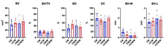 Mineralization was found to positively contribute to the BD (mCM, 3971.44 ± 85.21 vs. CM, 3860.78 ± 75.83; p = 0.021) and negatively for BH in the middle of the section (BH-M) (mCM, 0.27 ± 0.23 vs. CM, 0.55 ± 0.21; p = 0.30) without membrane placement, and positively for BV/TV underneath the membrane (mCM/M, 20.86 ± 4.55 vs. CM/M, 15.84 ± 3.28; p = 0.37). Membrane placement significantly decreased BH-M for CM (CM, 0.55 ± 021 vs. CM/M 0.21 ± 0.32, p = 0.38) and BD for mCM (mCM, 4002.47 ± 76.47 vs. mCM/M, 3909.22 ± 77.29; p = 0.43). When all groups were pooled for membrane placement, mean BH-M was higher for samples without (CM and mCM, 0.55 ± 0.21) than with membrane (CM/M and mCM/M, 0.27 ± 0.23; p = 0.30).