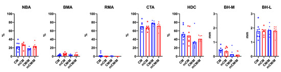 The mCM group showed highest mean values of NBA and BMA (Figure 7). Nevertheless, no significant differences were observed for any area parameters between the four groups. Mineralization of CM significantly increased BMA without membrane placement (mCM 5.74 ± 2.73 vs. CM 3.01 ± 1.62, p = 0.045) and reduced RMA (CM/M 0.71 ± 0.68 vs. mCM/M 0.00 ± 0.00, p = 0.032) underneath the membranes. Highest mean HDC and BH-M were observed for CM, without reaching statistical significance for any of the linear parameters between the groups. When all groups were pooled for membrane placement, mean BH-M was significantly higher for samples gathered without (CM and mCM, 0.39 ± 0.25) than with membranes (CM/M and mCM/M, 0.13 ± 0.23; p = 0.009).