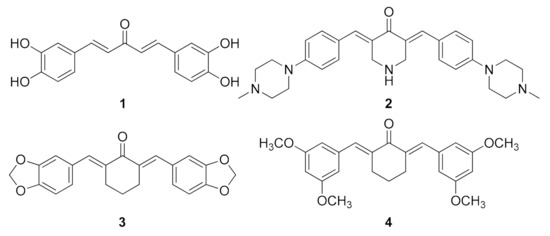Orlando et al. synthesized MAC derivatives with 5-carbon spacer between the aromatic rings. Compound 1 in Figure 1 showed a higher percentage of anti-Aβ aggregation activity compared to curcumin (IC50 0.8 µM vs. IC50 1.0 µM) [111]. In addition, newly synthesized monocarbonyl derivatives with a piperidone structure in the linker (2) are identified as potent inhibitor of Aβ fibrillation. Furthermore, substitution of a nitrogen atom within the piperidone ring with a carbon atom or N-methylation reduced the antiaggregation activity. The aliphatic linker gives the ideal flexibility, while the N-methylpiperazine groups on the two aromatic ends enhance hydrogen bond interactions with Aβ peptides. Compound 2 decreased the β-sheet structure and stabilized the α-helix content as assessed by circular dichroism spectroscopy (CD). In addition to the antiaggregating activity, compound 2 showed antioxidant and metal chelating properties [113]. MAC 3 was demonstrated to be more stable than curcumin at physiological pH. Furthermore, UV measurements of MAC 3 revealed that its spectra remained unchanged over time, while UV spectra of curcumin showed a decreased intensity and a shift towards the red. The protein hen egg white lysozyme (HEWL) was used as a model protein to study the inhibitory effect of MAC 3 on amyloid formation. MAC 3 also exhibits an optimal length of linker (8.84 Å) and it is more rigid than curcumin due to the absence of rotating sp3 carbon within the backbone. These structural features make it as an ideal inhibitor of Aβ aggregation. Fluorescence measurements using the molecular probe 8-anilinonaphatalene-sulphonate (ANS), showed decreased hydrophobic surface upon treatment with the curcumin analog MAC 3. Docking studies demonstrated that the compound binds to the catalytic tryptophan (62 and 63) of HEWL with the carbonyl component pointing toward the hydrophilic residues of the active site [114]. The monocarbonyl-cyclohexanone derivative 4 was tested in vitro as an antioxidant agent and showed good scavenging activity for reactive oxygen species (ROS) [115]. MAC 4 exhibits antioxidant properties and protective effect against H2O2-induced cytotoxicity in PC12 cells. The compound was able to rescue the levels of glutathione (GSH) as well as the activity of superoxide dismutase and catalase. Moreover, compound 4 showed to increase mRNA expression of Nrf2, a key transcription factor of the antioxidant response [115].