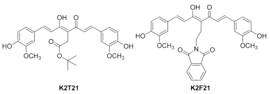 Ferrari et al. synthesized curcumin analogs, known as K2T, by introducing t-butyl ester in the C4 position [109]. K2T derivatives exhibit metal chelating properties towards gallium and copper ions and inhibit Aβ aggregation. The presence of alkyl substituent shifts the tautomeric equilibrium towards the di-keto tautomer and limits the radical scavenging ability. K2T21 (Figure 2) is the best compound of this series with a good metal chelating property. In addition, the Cu(II):K2T21 complex maintains a scavenger activity [109]. The derivative K2F21 (Figure 2), functionalized with a phthalimide group in the α-position and vanillin-like structure on the aromatic portion, showed a higher stability, depolymerization, antioxidant and antiapoptotic activities [116]. Molecular docking simulations showed a high probability of van der Waals interactions of K2F21 with β2-site of Aβ1-40 fibrils. The β2-binding site is located within the residues 31–40, which is a region known to be involved in modulating Aβ aggregation through the action of methionine 35 (Met35) [116].
