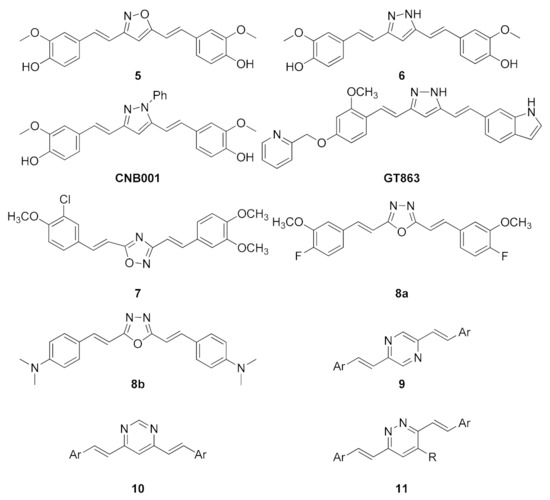 Heterocyclic derivatives of curcumin also include compounds with an oxadiazole ring instead of a β-diketone group. Our research group has synthesized a series of curcumin-like compounds with 1,2,4-oxadiazole or 1,3,4-oxadiazole motif. Compounds 7 and 8a were tested as Aβ aggregation inhibitors using different biophysical techniques and both showed to affect the aggregation pattern of Aβ [124]. Induced Fit Docking (IFD) observations revealed that both compounds bind to Aβ in a saddle between Met35 and Val39 via hydrophobic interactions. In the presence of compound 7 was observed a perturbation of β-sheet content, while it was partially preserved in the presence of compound 8a. The IFD results suggest that compound 8a can interfere with Aβ aggregation by hampering the packing of oligomers along the fibril major axis. On the other hand, due to steric hindrance, compound 7 interferes with the formation of β-sheet structure, resulting in the formation of toxic off-pathway structures. Indeed, compound 7 showed to trigger less Aβ aggregation and enhance Aβ 1-40 toxicity, probably due to the higher presence of toxic oligomers in the medium [124]. Other newly synthesized curcumin derivatives demonstrated modulation of the aggregation pathway of preformed tau oligomers. Particularly, compound 8b was found to convert toxic tau oligomers into more nontoxic tau aggregates and mitigated tau oligomer-associated toxicity in the human neuroblastoma cell line, SH-SY5Y, and primary neuronal cultures [87].