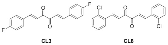 To overcome the instability issues due to the β-di keto moiety, our research group synthesized a library of curcumin-like compounds without the α-carbon within the linker (Figure 5). In the synthetic method adopted, the diacetyl reacted in a double aldol condensation with the appropriate aromatic aldehyde. The resulting compounds CL3 and CL8 were found to modulate the aggregation state of recombinant toxic tau oligomers and disease-relevant tau oligomers [87,128]. Notably, CL3 affected both the size and the surface hydrophobicity of brain-derived tau oligomers reducing their associated neurotoxicity [128].