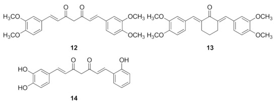 Compounds with an anti-Aβ aggregation activity were obtained by maintaining methoxy and hydroxy group in para- and meta- positions, while orto-substitution did not improve the activity. Compound 12 was obtained from curcumin through the substitution of the para-hydroxy group with a methoxy group. Researchers observed a decreased polarity and an increased permeability across the BBB. Moreover, this substitution preserves the conjugation reaction of -OH groups with sulphate or glucuronide groups [111]. In addition, the mono-carbonyl compound 13 methoxy substituted showed an improved inhibitory activity on Aβ aggregation [114]. Hitoshi et al. showed the importance of the catechol motif for anti-Aβ aggregation activity. Particularly, they demonstrated that the o-phenol derivative 14 increases the water solubility as compared to para- and meta- phenol. Previous studies reported that an increased dihedral angle improved water solubility. In o-phenol compound hydroxyl and β-di keto groups are close and can interact by participation of water. This interaction causes a torsion of the molecule, which increases the angle between the phenol group and central linker and, thus, increases water solubility [129]. Compound 14 is a potent inhibitor of BACE1 enzyme. Computational studies suggest that the inhibitor interacts with BACE1 in the P3 pocket. It did not interact with the aspartic acid residues of active site (Asp32 and Asp228); hydroxy groups and ketone motif are involved in hydrogen bonds with Glu230 and Glu339 [103].