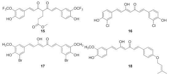 This derivative passes through the BBB and reaches the brain, where it can be detected using fluorine 19 by MRI. Moreover, the trifluoromethoxy group is important for anti-Aβ aggregation activity [118]. Several studies reported other halogenated curcumin derivatives as biologically active compounds for the treatment of AD, including the chloro-substituted compound 16 [130]. In addition, the bromo-derivative 17 exhibits antioxidant properties [60]. Synthetic halogenated derivatives of curcumin have been identified as ligands for nuclear receptor of vitamin D as well as for nuclear receptor of retinoid (RXR and RAR) [131]. It was demonstrated that agonists of RXR stimulate Aβ clearance through induction of ApoE expression [132].