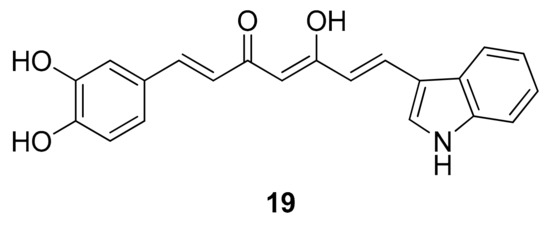 Among lateral changes made to the structure of curcumin there is the substitution of one aromatic group with an indole moiety. The asymmetric compound 19 showed an inhibitory activity against the BACE1 enzyme and can be considered as anti-AD drug (Figure 8) [103,134]. In this compound, the substitution of phenol group with the indole motif improves the H-bonds with BACE1 enzyme.