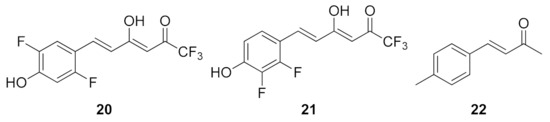 These derivatives were prepared following Pabon’s method starting from substituted benzaldehydes and di-ketonic compounds. Compounds 20 and 21 display metal chelating properties and scavenger activity against ROS. The para-hydroxy group is considered a required structural feature to exert the antioxidant effect [135].