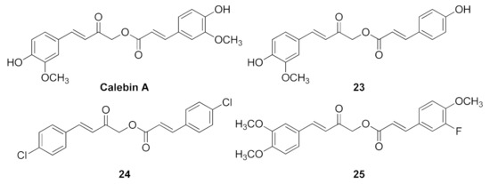 Compound 23 showed that the hydroxyl group is important to protect cells from Aβ25-35 associated toxicity [137]. Calebin A derivatives are usually obtained by protecting the aromatic substituents [138]. Compounds 24 and 25 were synthesized following an alternative synthetic procedure, by substitution reaction of a cinnamic acid derivative on iodoketone in basic conditions. Both compounds were shown to protect neuronal cultures from tau oligomer-associated neurotoxicity by promoting the formation of larger nontoxic tau aggregates [87].