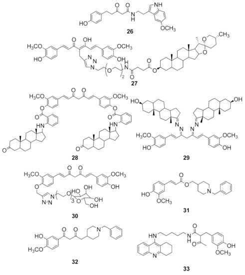 Bivalent compounds were created by binding curcumin to the steroidal compound diosgenin using linkers with different lengths. The steroidal part acts as an anchor to localize curcumin into membrane lipid raft where ROS and Aβ oligomers are produced. Compound 27 with steroid moiety attached to the α-carbon of curcumin showed better neuroprotective property than those with a different position attachment. In addition, it exhibited antioxidant and anti-Aβ aggregation inhibitor activities [142]. Steroidal compounds 28 and 29 increased acetylcholine in the brain through inhibition of AChE activity and overexpression of choline acetyl transferase levels. Moreover, both compounds exert an antioxidant effect due to the phenolic groups combined to the methylene group of β-diketone group. The steroid portion can be involved in an interaction with the estrogen receptors and modulate the expression of antioxidant enzymes via intracellular pathway. Additionally, the increased levels of GSH may have a decisive role in the antioxidant effects observed. Both compounds exhibit an antiapoptotic activity as a result of the overexpression of the antiapoptotic factor Bcl2 in the brain of AD mice model [143]. Therefore, these hybrid molecules can be considered as an alternative approach to reverse the oxidative stress in neurodegeneration [143]. Additionally, bioconjugates of curcumin with demethylenated piperic acid, valine or glutamic acid display a protective effect against GSH depletion in dopaminergic neuronal cells and, therefore, may exert their antioxidant activities in the treatment of Parkinson’s disease [144]. To increase curcumin water solubility, a sugar moiety was attached to the phenol residues. The hydroxyl groups of sugar can act as β-sheet breakers through competitive hydrogen bonding with amyloids fibrils. Sugar-curcumin conjugate 30 was shown to inhibit Aβ and tau aggregation [145].