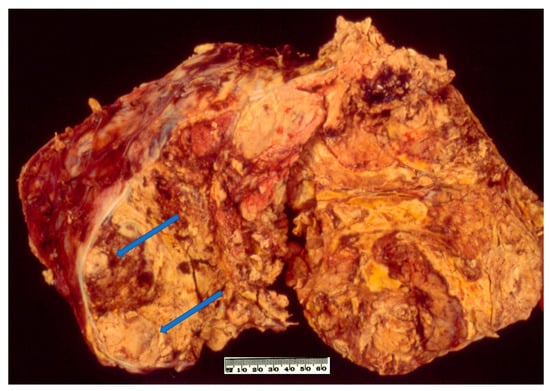 Oncocytic adrenocortical carcinoma showing tan lobular tumour on macroscopic examination. The tumour is rimmed by normal adrenal cortex (yellow colour, arrows).