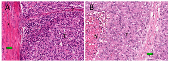 Histological features of ACC. (A) Tumour cells (T) with eosinophilic cytoplasm with thick fibrous bands (F). (B) Tumour cells (T) with necrosis (N) (haematoxylin and eosin stain) (scale bar–100 µm).