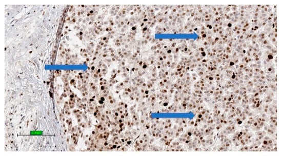 Adrenocortical carcinoma of high Ki-67 index with high percentage of nuclear stain (brown colour) for Ki-67 (3,3′-diaminobenzidine/haematoxylin stains) (blue arrows) (scale bar—100 µm).