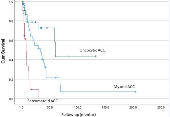 Overall, the prognosis of patients with ACC is poor. A recent Danish study on 160 patients with ACC showed that a median survival of patients with ACC was 35 months [14] whereas in the study based on the USA SEER database, the median survival of patients with ACC was 17 months [4]. The 5-year cancer specific survival rate of patients with ACC as noted from USA SEER database was 38% [1]. It is worth noting that surgery on the primary site even in metastatic ACC significantly improved overall and cancer-specific survival of patients with ACC [80]. The 5 year-survival of adult patients from multiple datasets with ACC after surgery range from 40% to 70% [49,81]. The estimated five-year overall survival rate for patients with ACC in recent cohorts is slightly less than 50% [11]