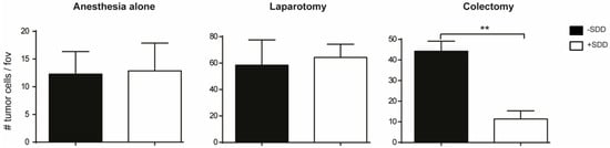 Numbers of tumor cells per field of view (fov) in the liver of rats that were treated without (black bars) or with SDD (white bars) regime and underwent anesthesia alone, laparotomy or colectomy. ** p < 0.01.