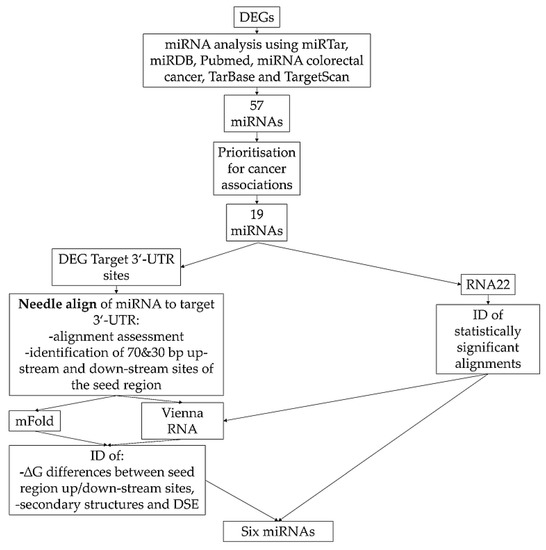RNA22 [39] was used for identification of statistically significant (p ≤ 0.05) alignments between DEG target 3′-UTR sites and miRNAs. The settings used in the analysis were: 8-mer or 7-mer seed binding, 1 unpaired sequence in seed region, 1 G:U wobble, maximum folding energy for heteroduplex −12.0 and 20.0 kcal/mol. The heteroduplex energies with cut-off −12.0 and −20.0 kcal/mol used in RNA22 were the energies suggested by the software and the typical setting described in the study by Miranda, Huynh, Tay, Ang, Tam, Thomson, Lim and Rigoutsos [39]. Results of individual analyses were compared for possible overlaps. The full workflow of the prioritization is shown in Figure 1.