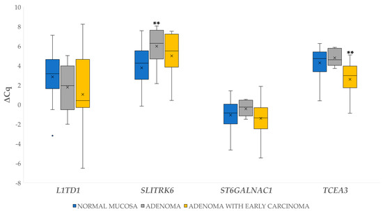 Expression (∆Cq) of four genes (L1TD1, SLITRK6, ST6GALNAC1, TCEA3) in normal mucosa, adenoma and adenoma with early carcinoma. Legend: x, mean; ◦, outlier; ** p ≤ 0.01.