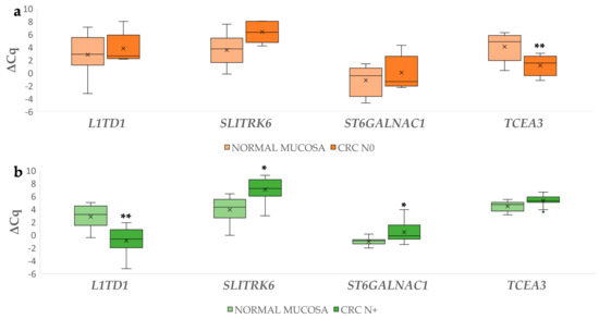 Expression (∆Cq) of the investigated genes in carcinoma without (a) and with lymph node metastases (b) and corresponding normal mucosa. Legend: CRC N0, colorectal carcinoma without lymph node metastases; CRC N+, colorectal carcinoma with lymph node metastases; x, mean; ◦, outlier; * p ≤ 0.05; ** p ≤ 0.01.