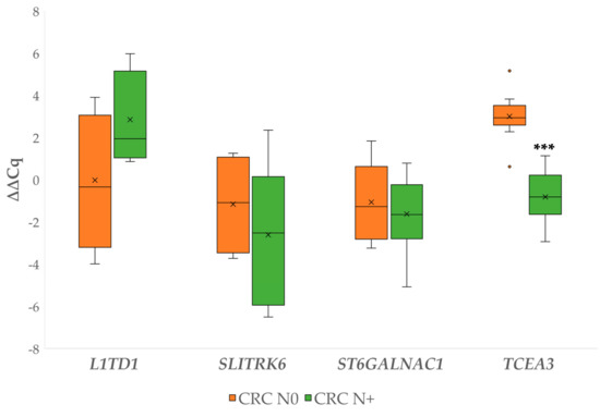 Expression (∆∆Cq) of the investigated genes (L1TD1, SLITRK6, ST6GALNAC1, TCEA3) in carcinoma without and carcinoma with lymph node metastases. Legend: CRC N0, colorectal carcinoma without lymph node metastases; CRC N+, colorectal carcinoma with lymph node metastases; x, mean; ◦, outlier; *** p ≤ 0.001.