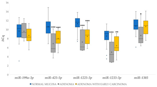 Expression (∆Cq) of the investigated miRNAs in normal mucosa, adenoma and adenoma with early carcinoma. Legend: x, mean; ◦, outlier; * p ≤ 0.05; ** p ≤ 0.01; *** p ≤ 0.001.