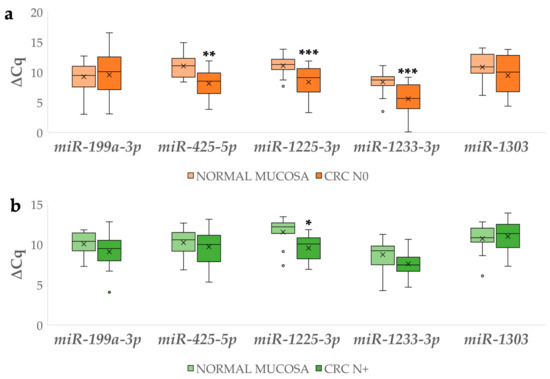 Expression (∆Cq) of the investigated miRNAs in carcinoma without (a) and with lymph node metastases (b) in comparison to corresponding normal mucosa. Legend: CRC N0, colorectal carcinoma without lymph node metastases; CRC N+, colorectal carcinoma with lymph node metastases; x, mean; ◦, outlier; * p ≤ 0.05, ** p ≤ 0.01; *** p ≤ 0.001.