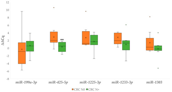 Expression (∆∆Cq) of the investigated miRNAs in carcinoma without and with lymph node metastases. Legend: CRC N0, colorectal carcinoma without lymph node metastases; CRC N+, colorectal carcinoma with lymph node metastases; x, mean; ◦, outlier; ** p ≤ 0.01.