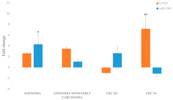 Expression of L1TD1 and miR-1303 in adenoma, adenoma with early carcinoma and carcinoma without and with lymph node metastases. Legend: CRC N0, colorectal carcinoma without lymph node metastases; CRC N+, colorectal carcinoma with lymph node metastases; * p ≤ 0.05; ** p ≤ 0.01.