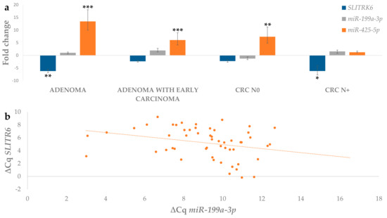 (a) Expression of SLITRK6, miR-199a-3p and miR-425-5p in adenoma, adenoma with early carcinoma and carcinoma without and with lymph node metastases; (b) Correlation between expression (∆Cq) of miR-199a-3p and target gene SLITRK6. Legend: CRC N0, colorectal carcinoma without lymph node metastases; CRC N+, colorectal carcinoma with lymph node metastases; * p ≤ 0.05; ** p ≤ 0.01; *** p ≤ 0.001.
