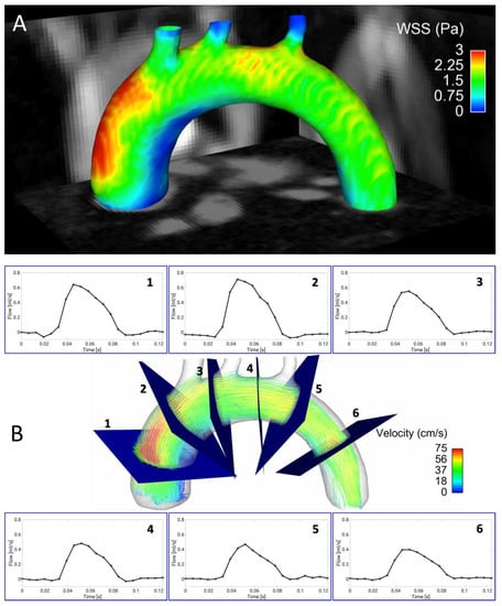 Four-dimensional (4D) flow and wall shear stress (WSS) measurements in the murine aortic arch. (A) Wall shear stress map of the aortic arch of an ApoE−/− mouse fed a Western diet, assessed with a self-gated radial 4D phase-contrast magnetic resonance imaging (PC-MRI) sequence [79]. Especially in the ascending aortic arch, a large region of low WSS can be observed in the inner curvature. This area is known to be prone to plaque development. (B) Streamline presentation of the measured flow and through plane flow for 6 exemplary analysis planes, obtained from the same 4D flow measurement [79,80].
