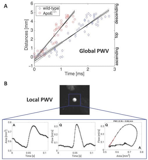 Global and local measurements of pulse wave velocity in murine vessels. (A) Assessment of global pulse wave velocity (PWV) for exemplary measurements in the aortic arch of a wild-type and an ApoE−/− mouse. For determination of the global PWV values, the time points of the early systolic upstrokes were measured for multiple planes along the aortic arch (see Figure 1B) and plotted against the locations of the planes. The PWV is derived from the slope of a line fitted to the data points [80]. (B) Exemplary measurement of the local PWV in the abdominal aorta of a wild-type mouse using a retrospectively navigated PC-Cine MRI technique [121]. The through-plane flow (Q) and the cross-sectional areas (A) were determined. The local PWV is derived from the Q-A curve by fitting a line to the early systolic data points.