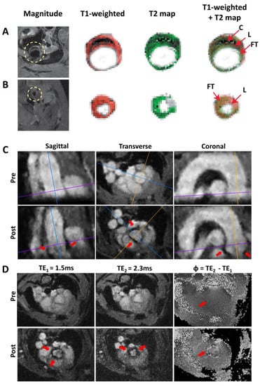 Morphology and inflammation imaging in murine atherosclerotic vessels. (A) Multispin multi echo (MSME) imaging of the ascending aorta (A) and the carotid artery (B) of an ApoE−/− mouse fed a western diet. FG: Fibrotic tissue. L: Lipid rich core. C: Calcified tissue. (C,D) 3D VCAM-1 (vascular cell adhesion molecule-1) Measurement [141]. (C) Sagittal, transverse, and coronal orientation of the aorta extracted from the radial 3D-Cine measurement (TE1 = 1.5 ms) before administration of the contrast agent (pre) and after administration of the contrast agent (post). The lines mark the slice orientations. Areas of signal cancellation due to iron particles are marked with red arrows. (D) Measurement of the aortic arch at one exemplary position (see purple line in Figure 3C). Measurement with TE1 = 1.5 ms, TE2 = 2.3 ms and map of the phase differences Φ = TE2 − TE1. No significant phase jumps can be found in the aortic vessel wall in the pre-contrast agent measurement (red arrow, pre), whereas in the phase difference map of the post-contrast agent (CA) measurement (see red arrow in bottom right image (post)), significant phase jumps are observable.