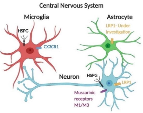 - Rauch, J.N.; Chen, J.J.; Sorum, A.W.; Miller, G.M.; Sharf, T.; See, S.K.; Hsieh-Wilson, L.C.; Kampmann, M.; Kosik, K.S. Tau Internalization is Regulated by 6-O Sulfation on Heparan Sulfate Proteoglycans (HSPGs). Sci. Rep. 2018, 8. [Google Scholar] [CrossRef]